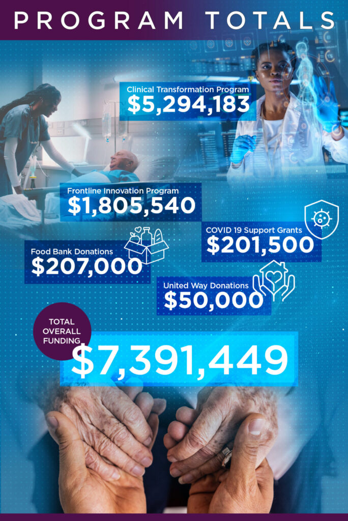 During the pandemic, a special COVID-19 Relief Grant campaign was launched as part of the Frontline Innovation Program. More than 80 proposals were received to provide financial relief and support the emotional well-being of caregivers, patients, and their communities. In all, more than $450,000 was awarded to support these one-time initiatives. Additional contributions were made to local food banks and United Way programs.